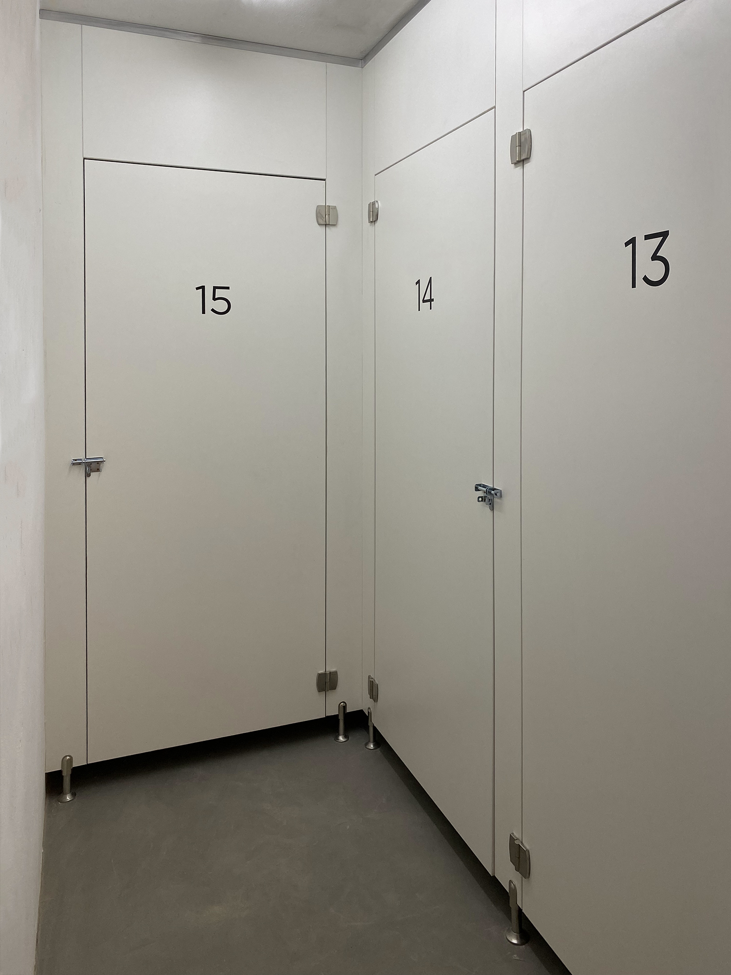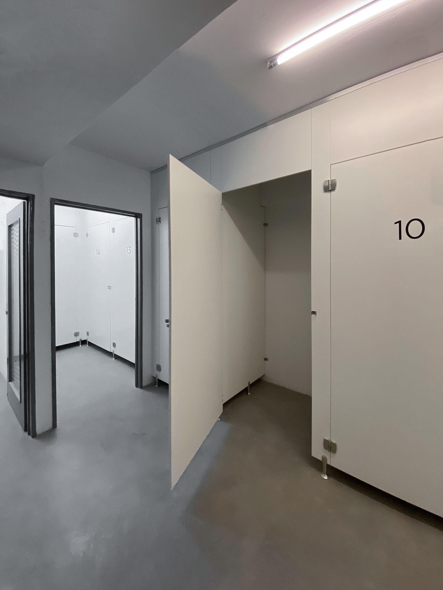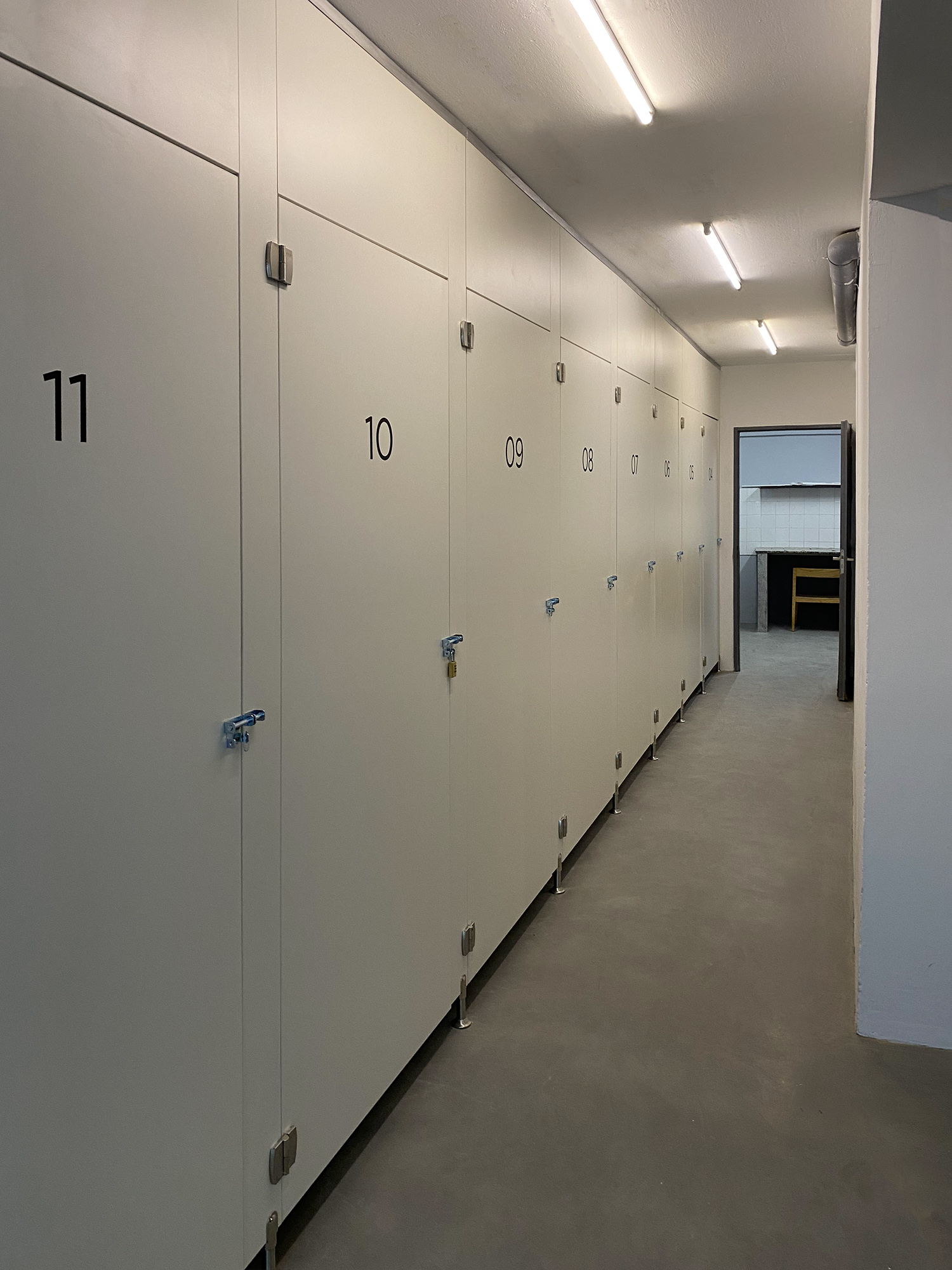 Los compartimientos fueron resueltos con tabiques y puertas numeradas en melamina blanca dispuestos en serie.