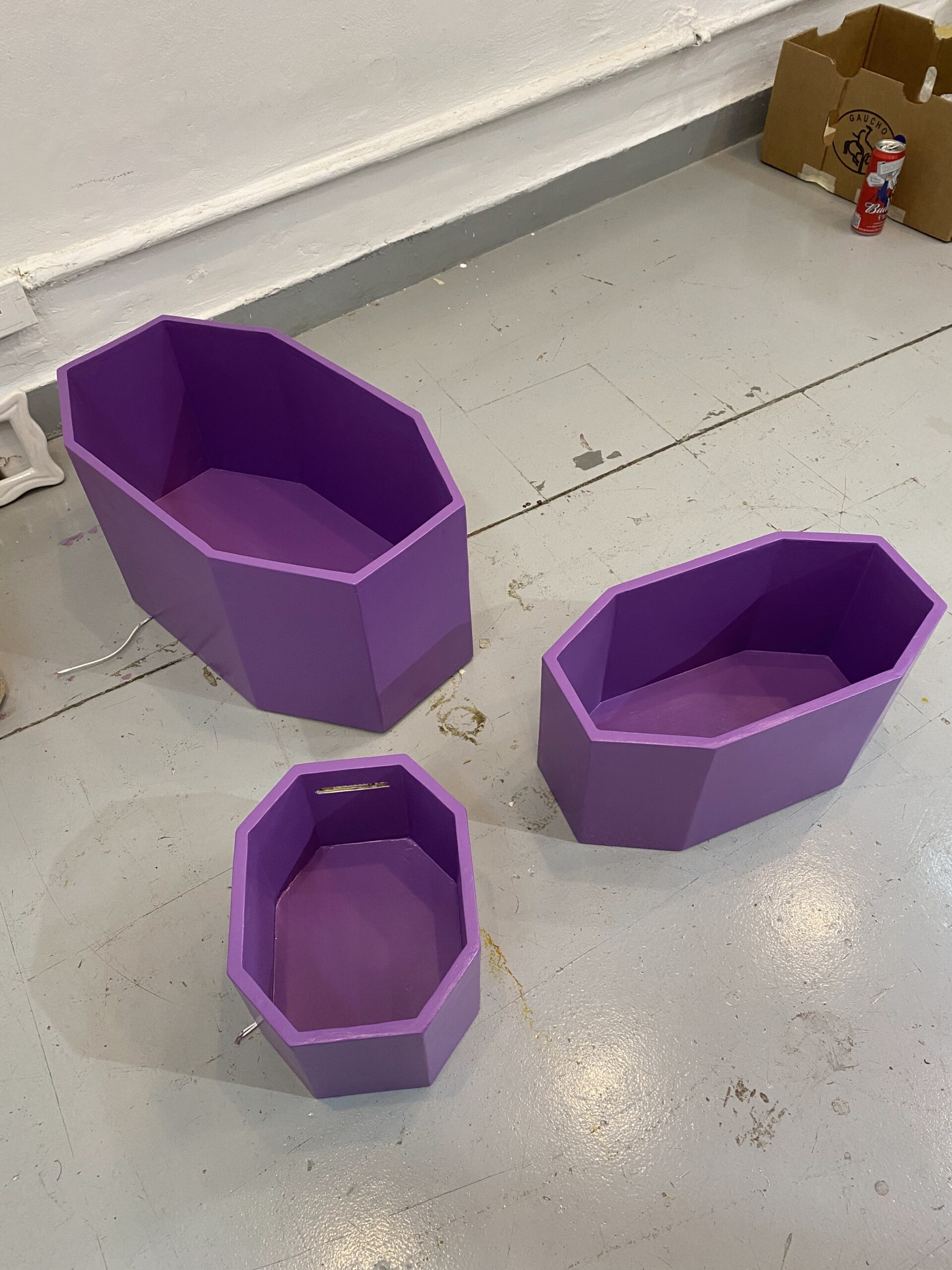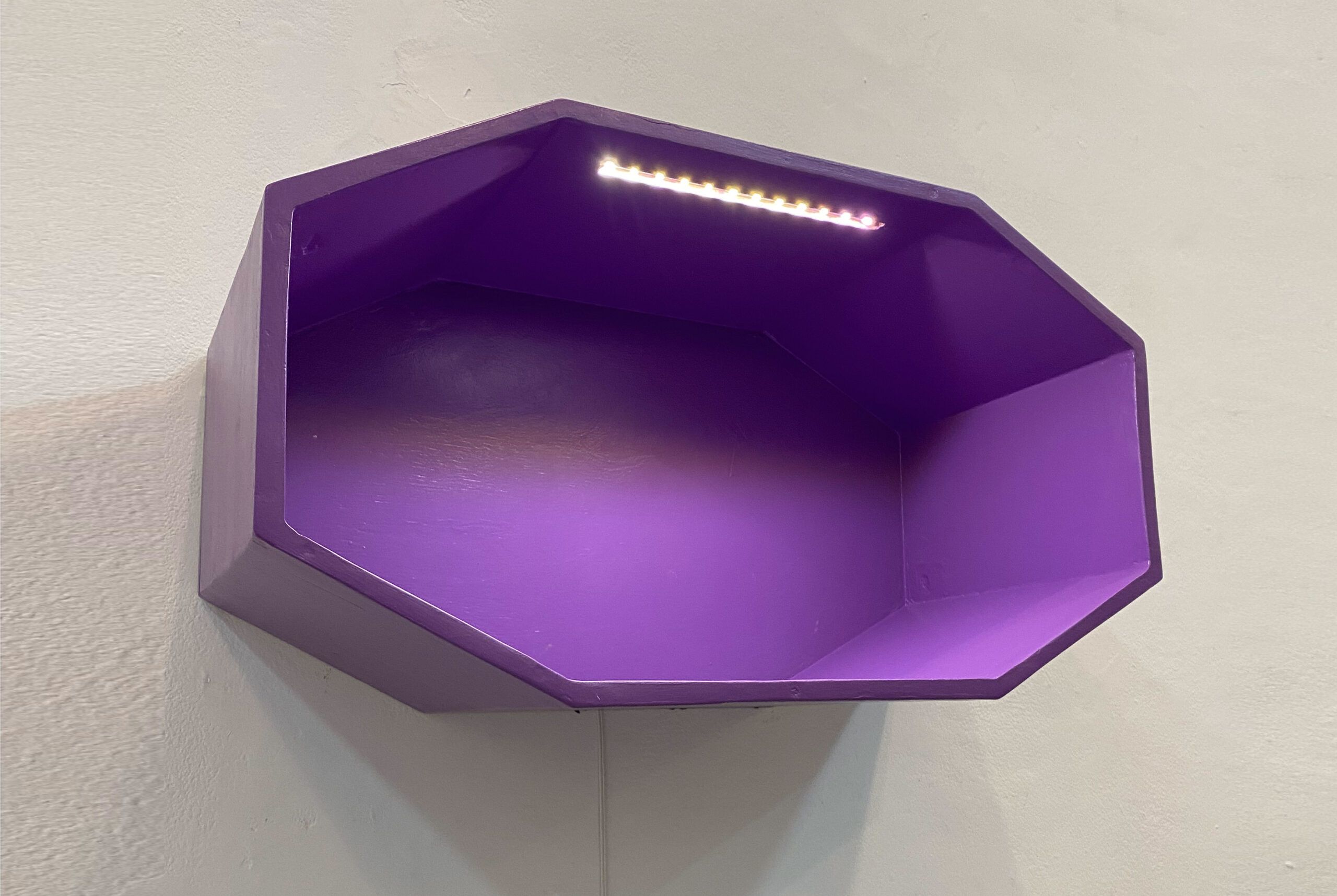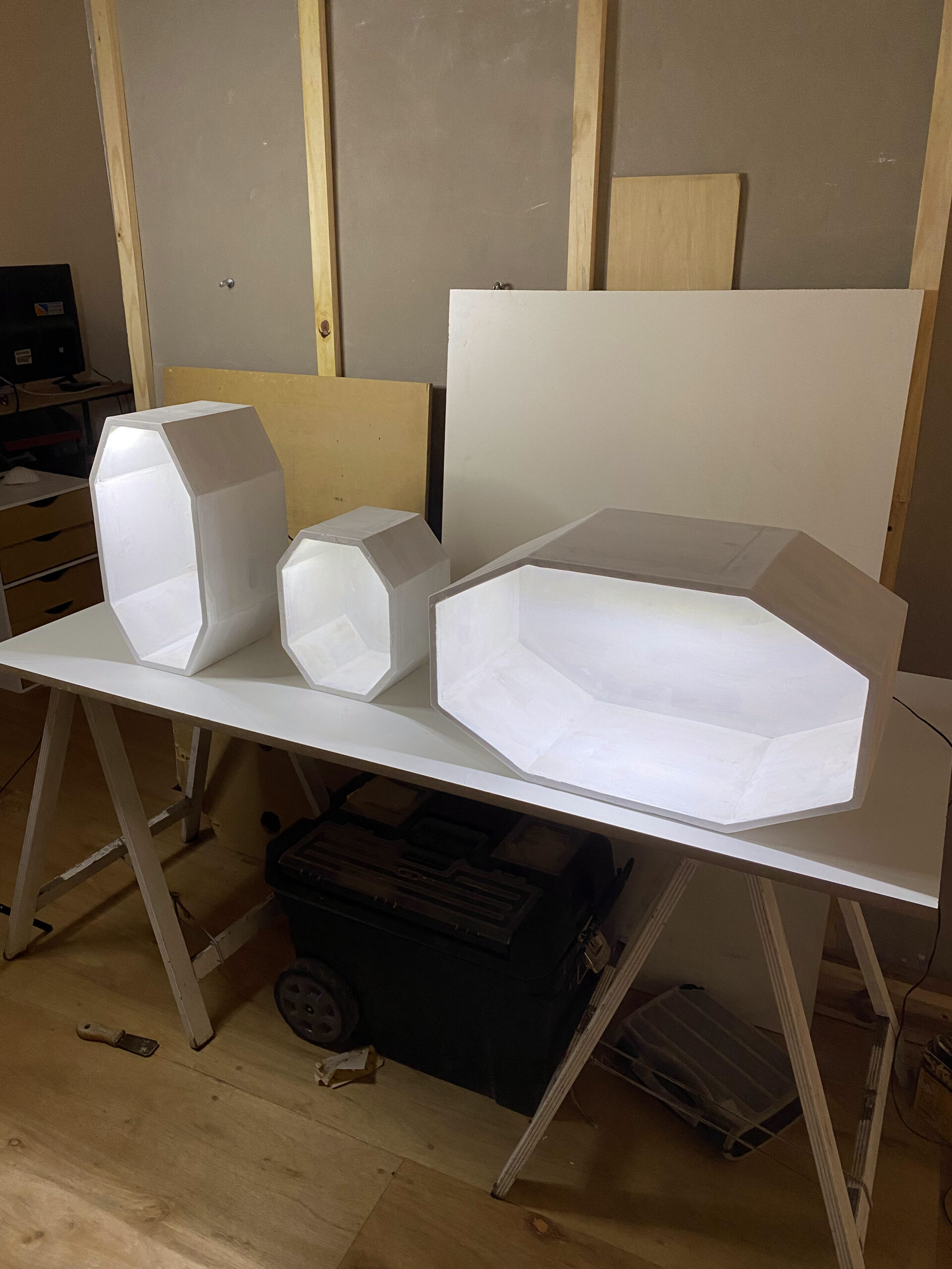 Ésta serie de cajas octogonales fueron diseñadas especialmente para una instalación de arte. Formaron parte de una muestra en sala, colgadas sobre la pared, y debían servir como contenedores de objetos iluminados desde adentro. Éste proyecto combinó precisión técnica, cuidado por los detalles y un fuerte trabajo en conjunto con el artista.