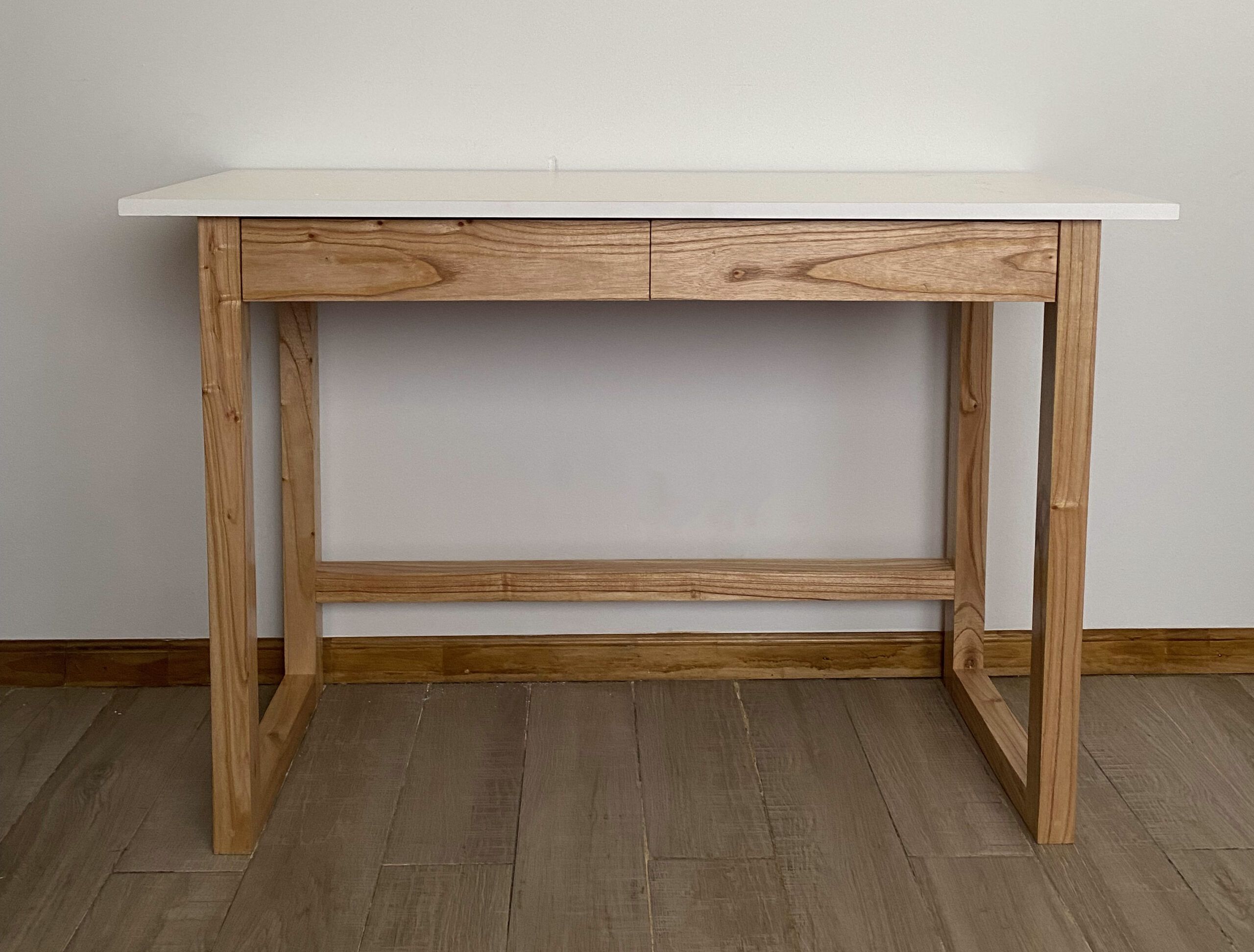 Éste escritorio simple y funcional combina una estructura de madera maciza de paraíso con una tapa de melamina blanca, materiales que contrastan entre sí para generar calidez. El diseño busca ser limpio y liviano visualmente, ideal para un espacio de trabajo o estudio.