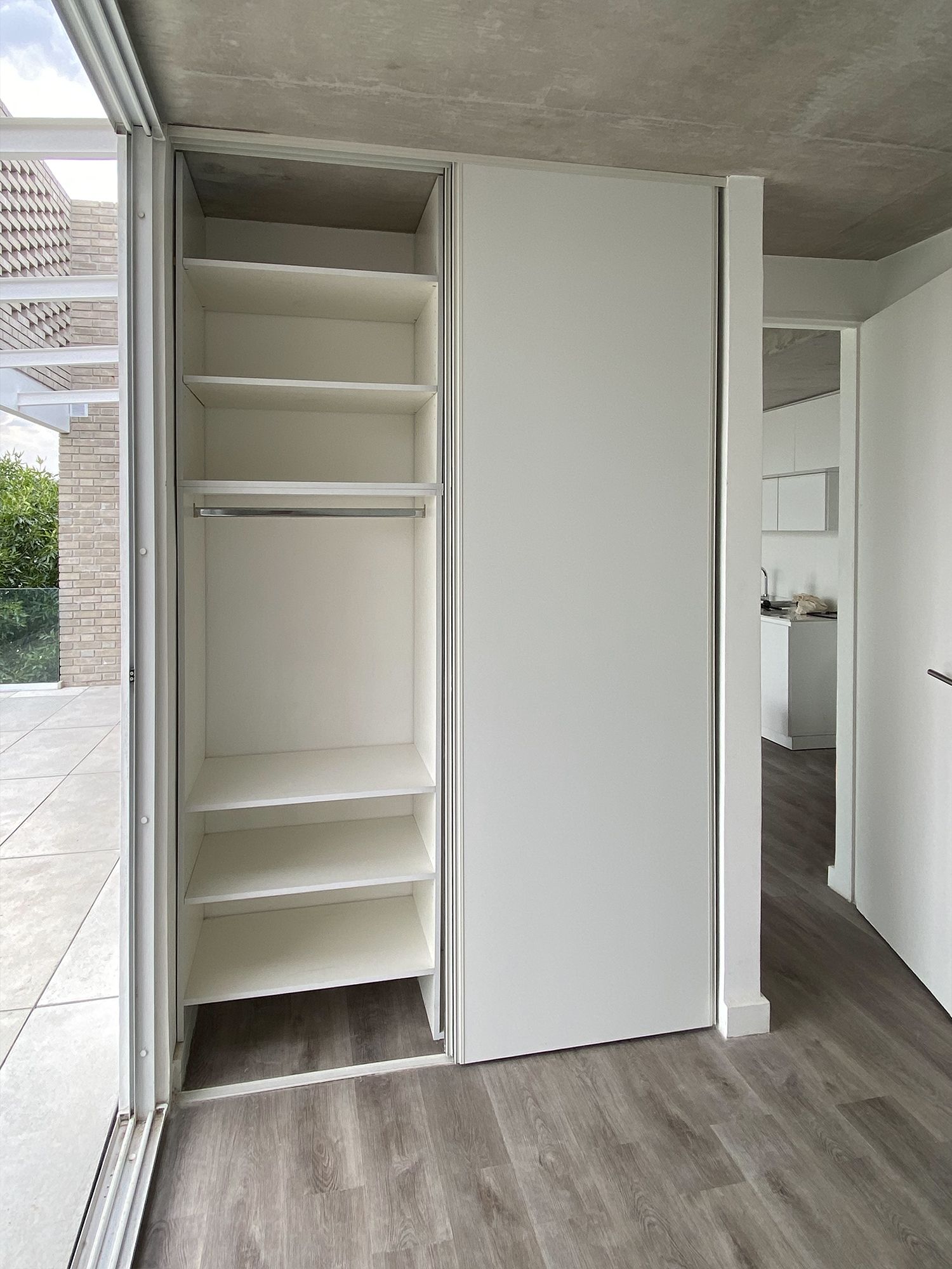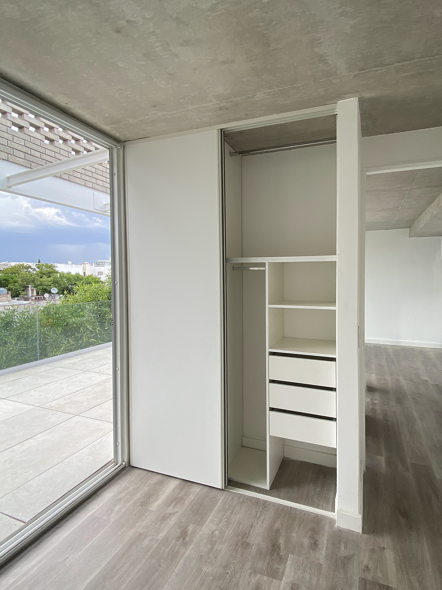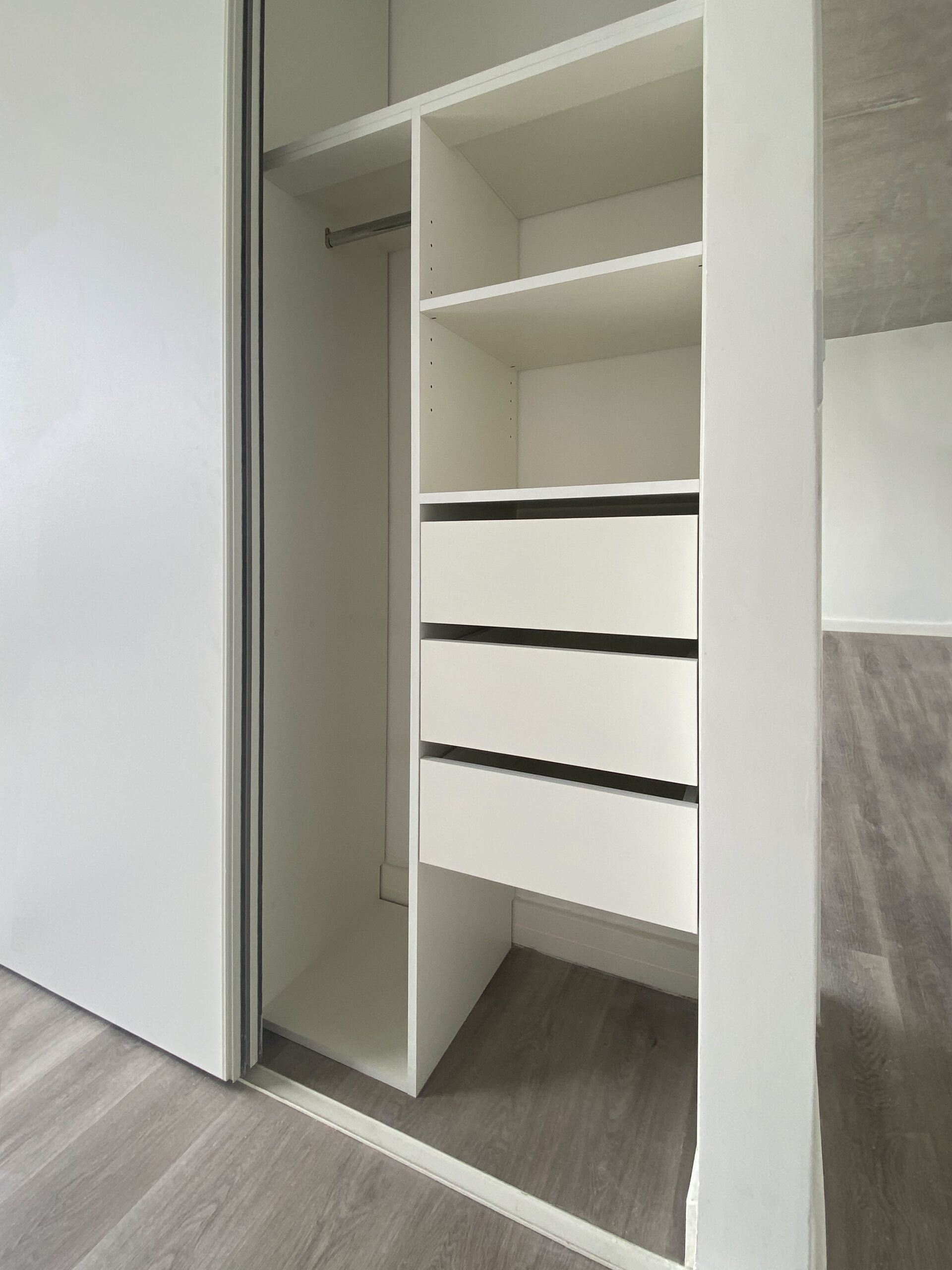 La distribución interior se definió de forma personalizada, priorizando funcionalidad y organización. En el módulo superior se incorporó un perchero destinado a prendas de otra temporada, permitiendo liberar espacio en las zonas de uso diario. A su vez, se dispuso un sector exclusivo para ropa larga como tapados y camperones.