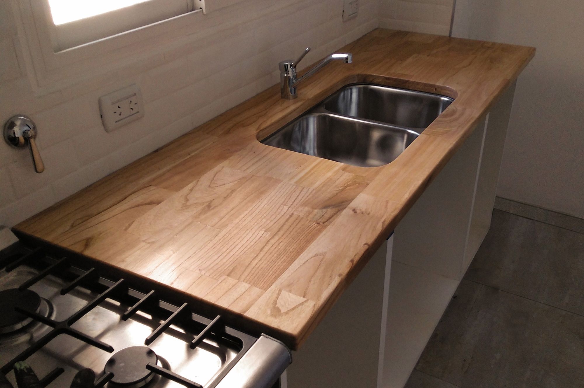 Finalmente, volvimos a la obra para hacer la instalación definitiva. Si bien la madera dura ofrece una excelente resistencia, recomendamos evitar apoyar directamente elementos muy calientes y considerar un mantenimiento periódico para prolongar su vida útil y mantener su belleza con el paso del tiempo.