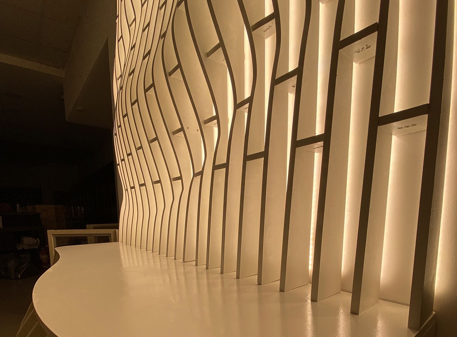 La cantidad de curvas que definían la forma del mueble representaron un desafío: La estructura se compone de una sucesión de cortes verticales, todos diferentes entre sí pero con una lógica de continuidad que genera una sensación de movimiento. Cada una de estas piezas fue ruteada individualmente a partir de placas de MDF, siguiendo archivos digitales precisos que permitieron mantener simetrías, distancias y puntos de encastre.