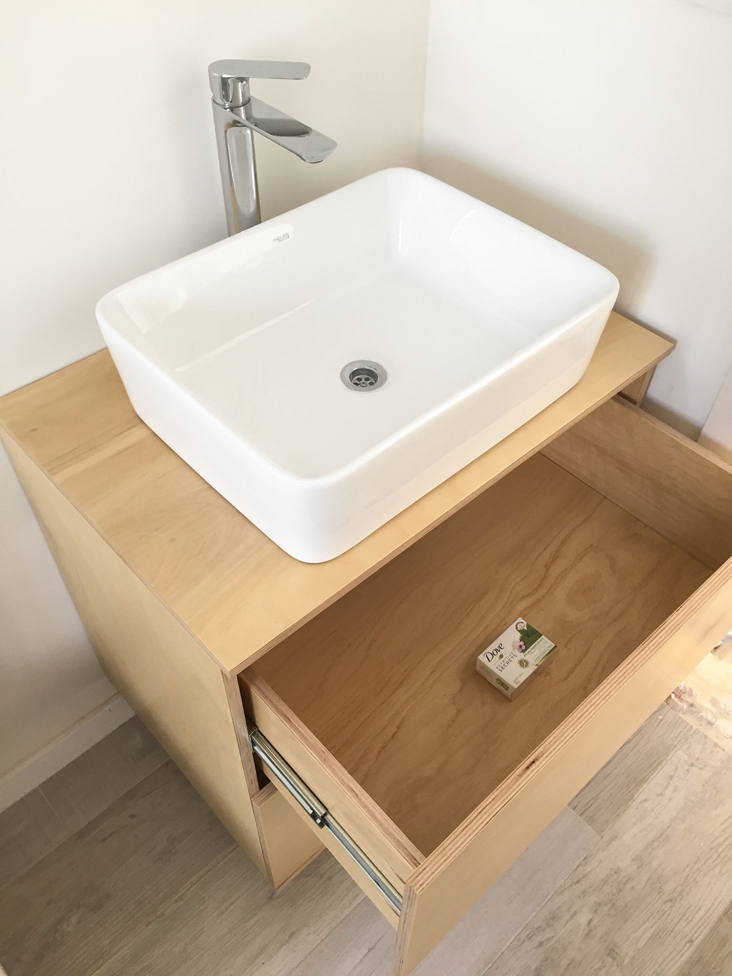 La estructura del mueble está pensada para ser resistente pero liviana, con fijaciones ocultas que permiten un montaje colgante limpio y seguro. Los cajones cuenta con correderas telescópicas ocultas, que aseguran un cierre suave y permiten aprovechar al máximo la profundidad útil. La cavidad para el sifón está oculta y optimizada, integrándose al diseño general sin interferencias.